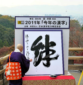 Every year around this time the Japan Association of Kanji Aptitude Test (日本漢字能力検定協会) announces the kanji of the year. The announcement is made in Kyoto at the famous Kiyomizu-dera temple through a priest who writes the chosen kanji on a big white board.