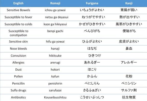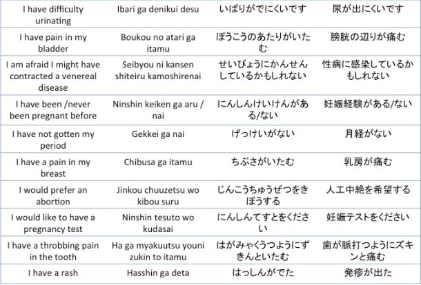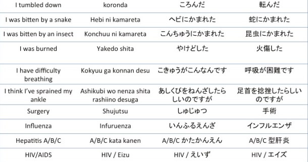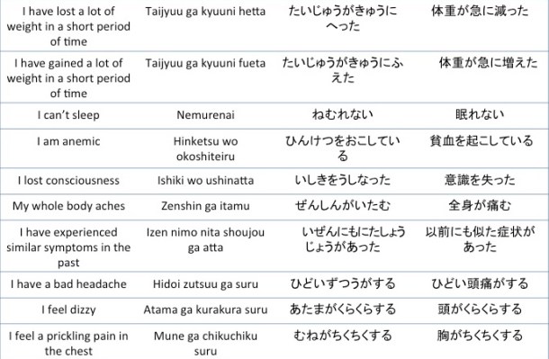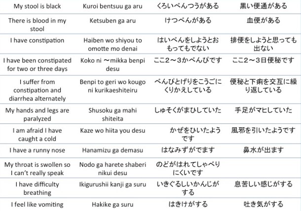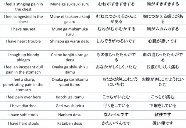 When staying in Japan for a certain amount of time you may have to go to the hospital. A few of them, especially in big cities such as Tokyo or Osaka have english speaking staff but most of the time it is not the case that is why a little basic sentences to describe your symptoms might be useful.